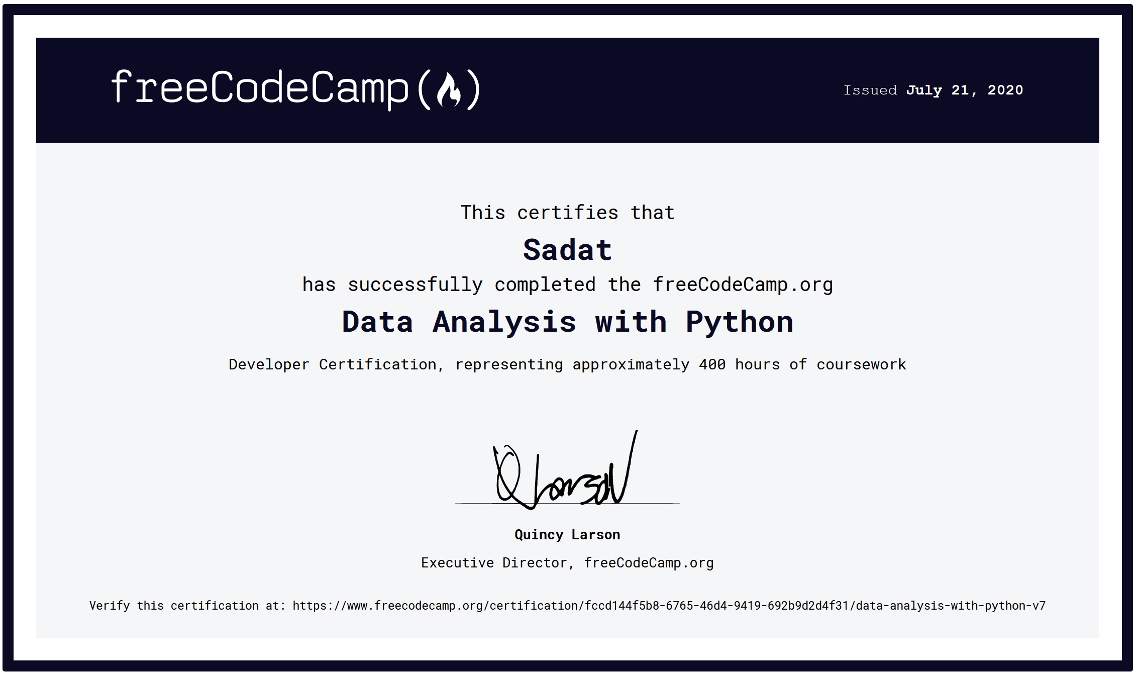 Using lectures create by Santiago Basulto from RMOTR, learnt the whole process of Data Analysis: reading data from multiple sources (CSVs, SQL, Excel, etc), processing them using NumPy and Pandas, visualize them using Matplotlib and Seaborn and clean and process it to create reports. During this coursework I also learnt the basics of Jupyter Notebook. This is a Developer Certification, representing approximately 400 hours of coursework.
